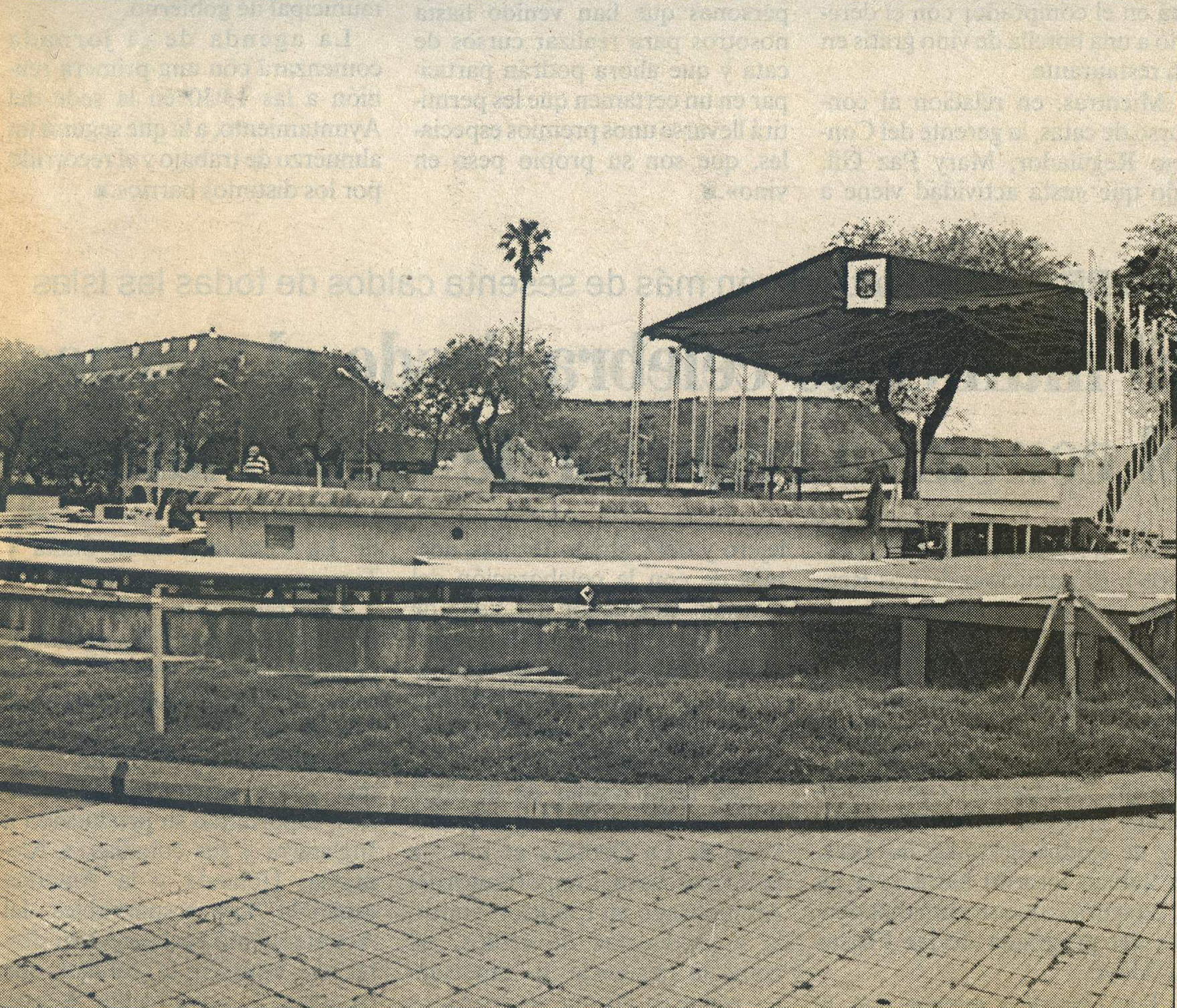 La parte superior de la fuente de la plaza de San Francisco está siendo cubierta, y en ella irá el altar, donde el obispo presidirá una misa concelebrada.