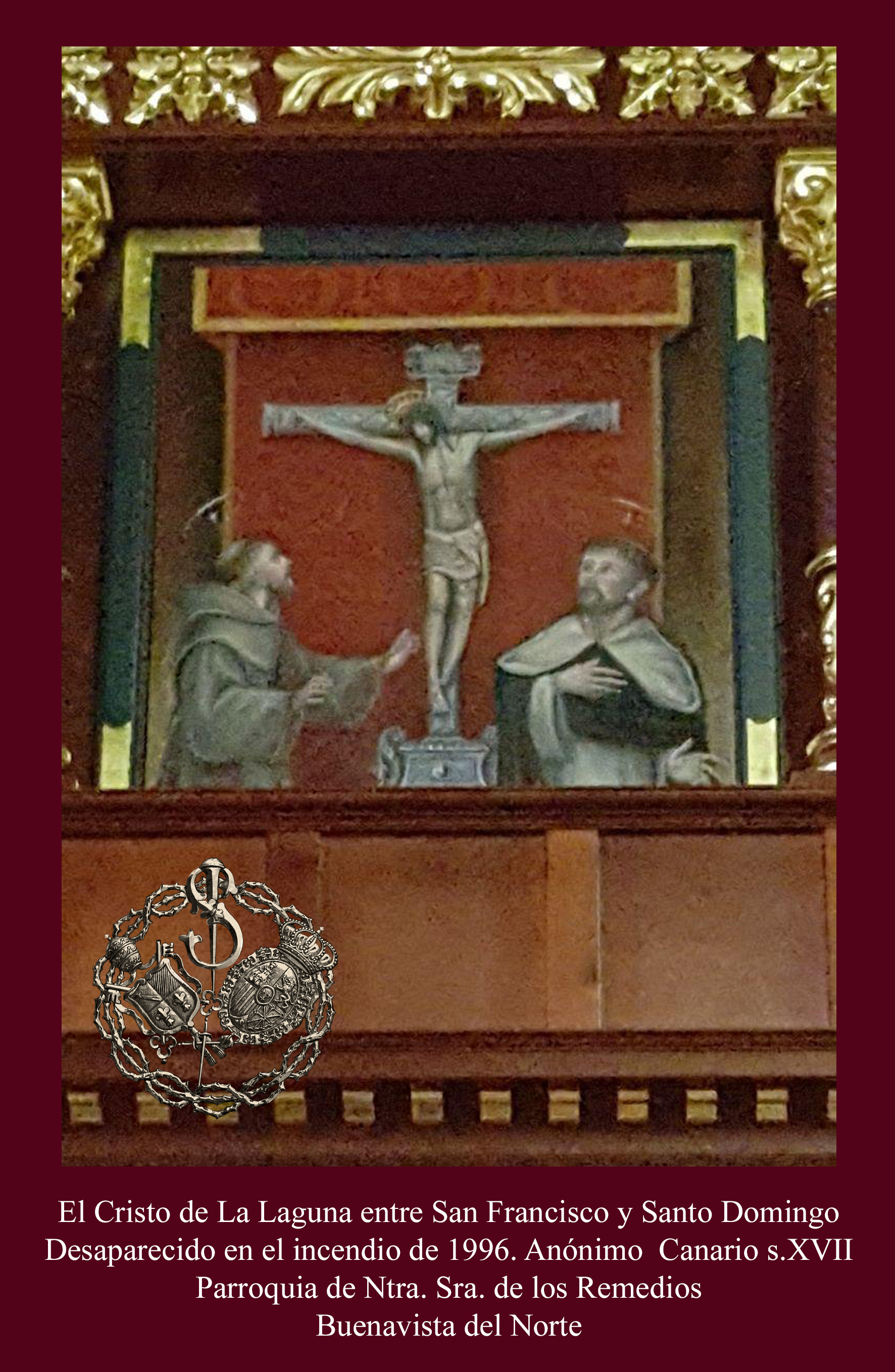 El Cristo de La Laguna entre San Francisco y Santo Domingo. Ático del retablo de la nave del Evangelio de la iglesia de Nuestra Señora de los Remedios en Buenavista del Norte. Desaparecido en el incendio de 1996. Anónimo Canario del siglo XVII. Actualmente se ha hecho una nueva réplica y se ha colocado en la misma ubicación que el anterior lienzo.